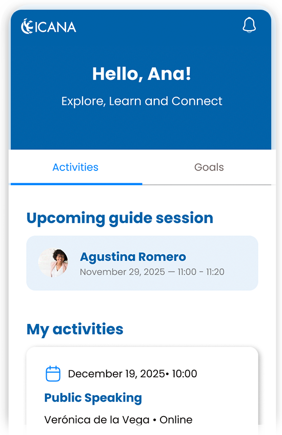 ICANA Connect rompe con la lógica rígida del aula y del manual. No seguís un programa: diseñás tu recorrido con lo que te inspira. No estudiás reglas: vivís el idioma y su cultura. No tenés que adaptarte a un horario y una modalidad: tenés flexibilidad para elegir. No hay exámenes obligatorios: los hacés si querés y cuándo querés.